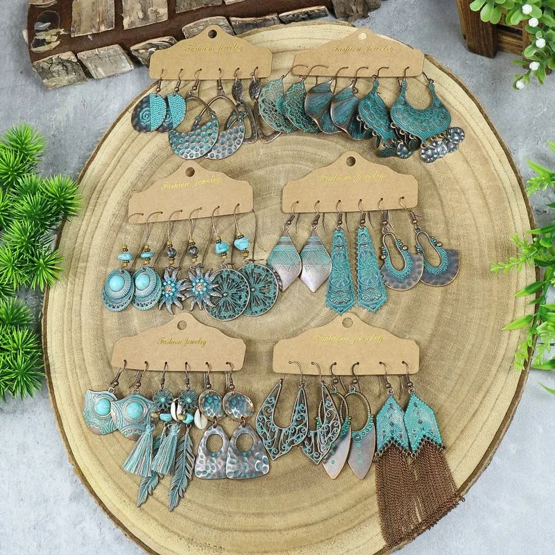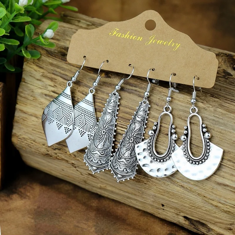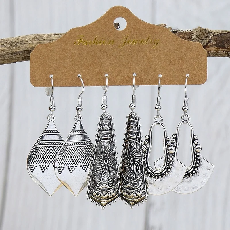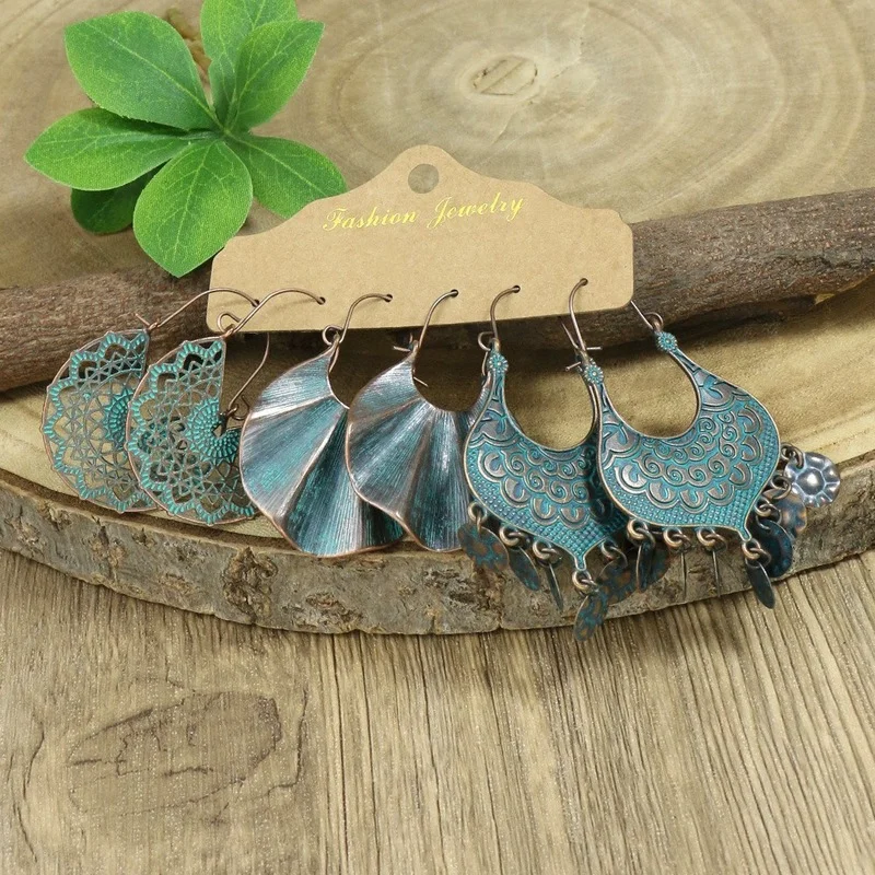 3 Pieces/Set Vintage Bronze Red Indian Antique Geometric Earring Set